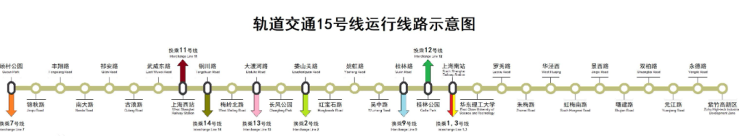 上海地铁15号线线路北起宝山区顾村公园站,途经普陀区、长宁区、徐汇区,南至闵行区紫竹高新区站 ,共5 个行政区,连接9 座高校,3 个国家级科创园区。